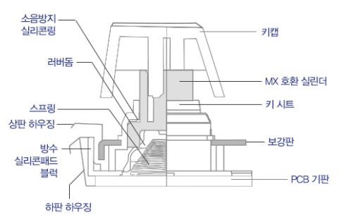 사진으로만 보면 기계식 키보드의 스위치에 있는 청, 적, 갈 또는 여러 색상이 없어서 멤브레인 키보드와 비슷하게 보입니다^^;; 하지만 작동 원리가 아예 다르다는 점이 있습니다.